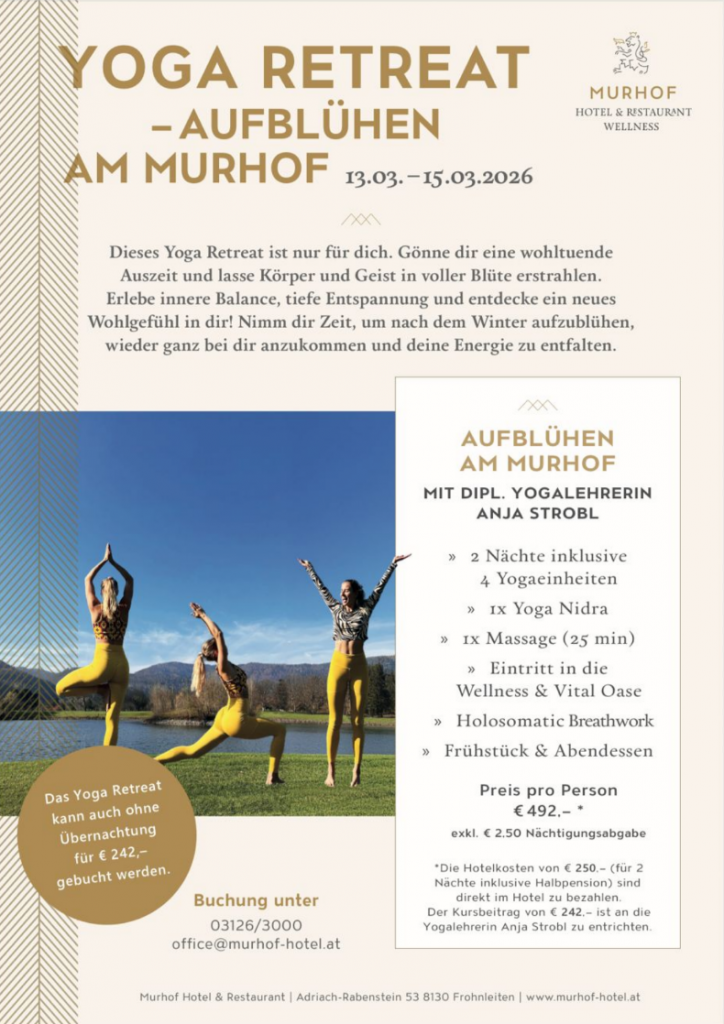 Die Buchung der Zimmer inkl. Verpflegung ist selbst und direkt beim Murhof unter 03126/3000 oder unter office@murhof-hotel.at zu machen!